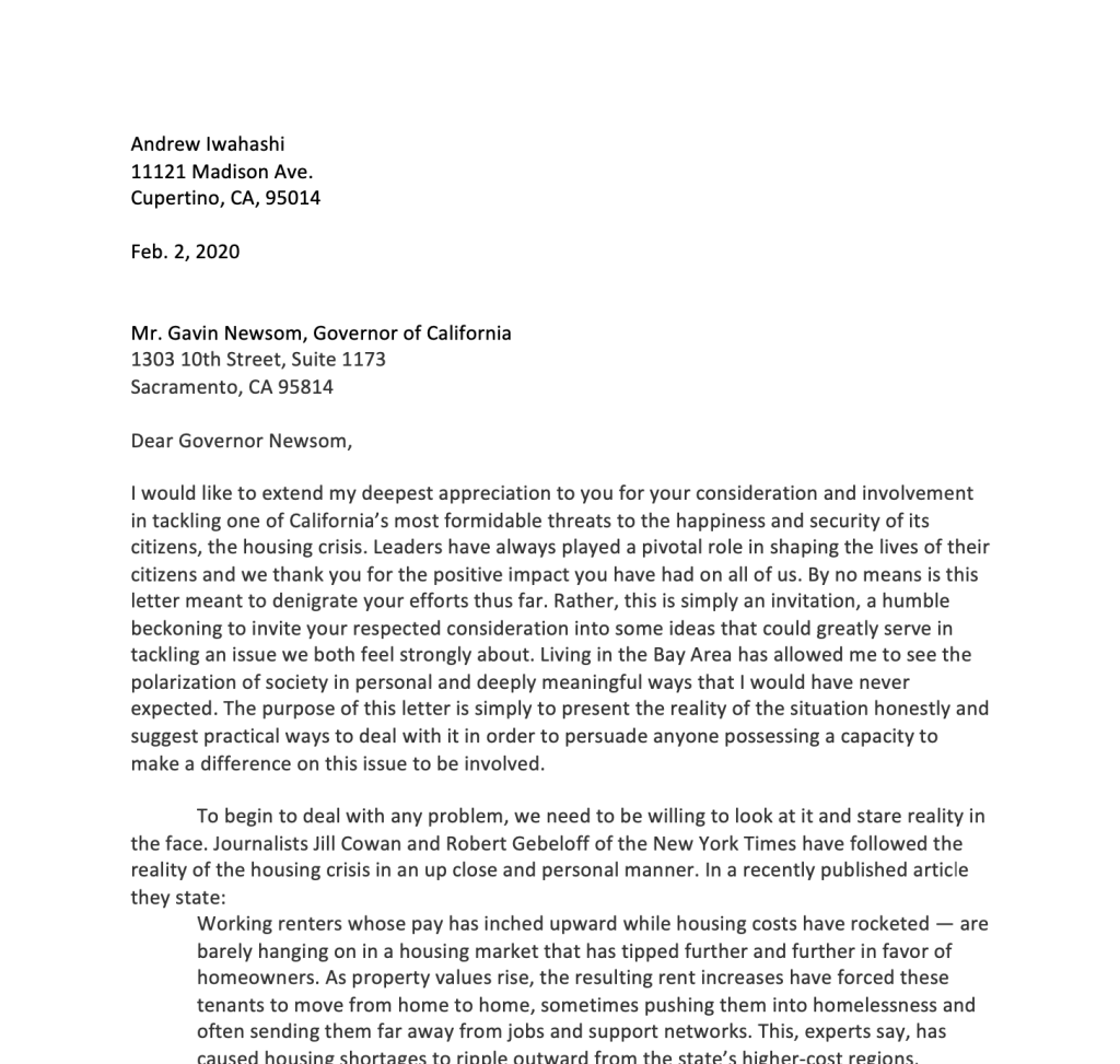 This is a formal proposal letter written to the governor of California, entreating his attention on the pressing issue of housing crisis that is currently plaguing the state. It is written in a professional and respectful tone without sacrificing the urgency of the message. This document exhibits my ability to professionally communicate to those of high repute, implying a strong grasp of professionalism in correspondence with colleagues, figures in business, industry representatives, superiors, team members, etc.